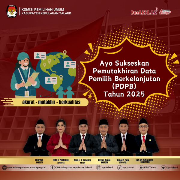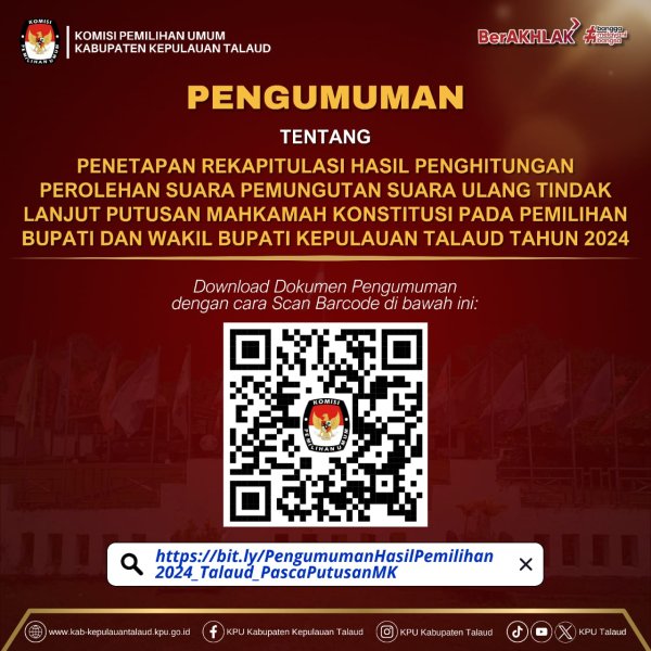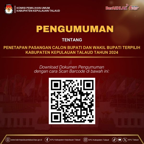 PENGUMUMAN NOMOR 11/PL.02.7-Pu/7104/2/2025 TENTANG PENETAPAN PASANGAN CALON BUPATI DAN WAKIL BUPATI TERPILIH KABUPATEN KEPULAUAN TALAUD TAHUN 2024 Berdasarkan Berita Acara Komisi Pemilihan Umum Kabupaten Kepulauan Talaud Nomor 61/PL.02.7-BA/7104/2/2025 tentang Penetapan Pasangan Calon Bupati dan Wakil Bupati Terpilih Kabupaten Kepulauan Talaud Tahun 2024, Komisi Pemilihan Umum Kabupaten Kepulauan Talaud mengumumkan Keputusan KPU Kabupaten Kepulauan Talaud Nomor 27 Tahun 2025 tentang Penetapan Pasangan Calon Bupati dan Wakil Bupati Terpilih Kabupaten Kepulauan Talaud Tahun 2024 yang dapat diunduh pada link berikut : LINK PENGUMUMAN KLIK DISINI  LINK SALINAN SK KLIK DISINI