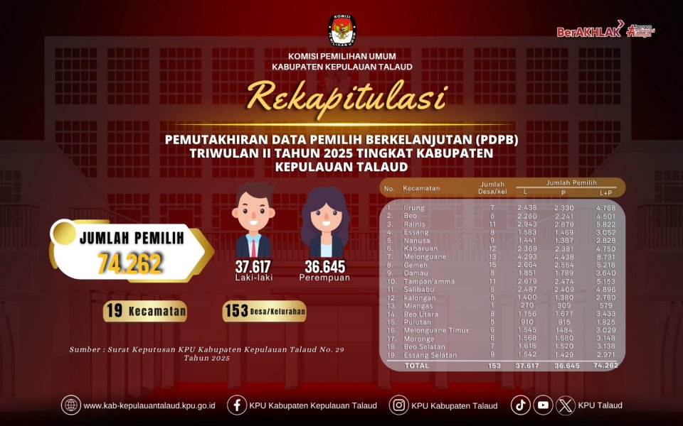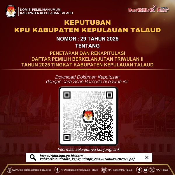 Melonguane,                                                  kab-kepulauantalaud.kpu.go.id-                Berikut ini adalah Keputusan KPU Kabupaten Kepulauan Talaud Nomor 29 Tahun 2025 Tentang Penetapan dan Rekapitulasi Daftar Pemilih Berkelanjutan Triwulan II Tahun 2025 Tingkat Kabupaten Kepulauan Talaud. Download Keputusan Dengan Cara Scan Barcode Atau Kunjungi link Dibawah Ini #KPUMelayani
