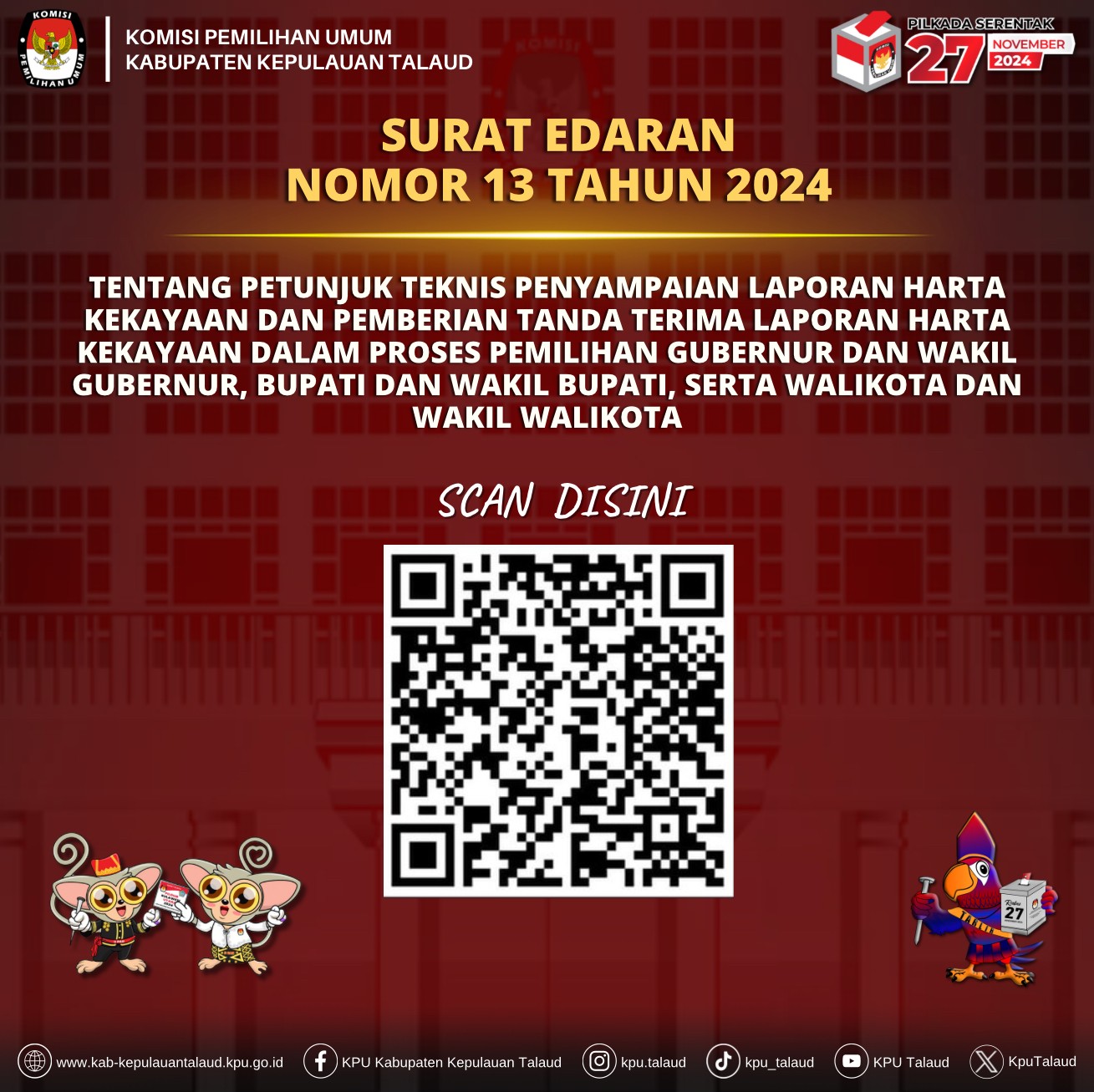 Melonguane, kab-kepulauantalaud.kpu.go.id. berikut Surat Edaran Nomor 13 Tahun 2024 Tentang Petunjuk Teknis Penyampaian Laporan Harta Kekayaan dan Pemberian Tanda Terima Laporan Harta Kekayaan Dalam Proses Pemilihan Gubernur dan Wakil Gubernur, Bupati dan Wakil Bupati Serta Walikota dan Wakil Walikota.