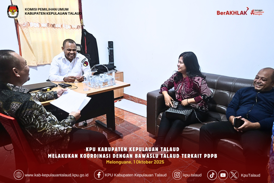 Melonguane, kab-kepulauantalaud.kpu.go.id- KPU Kabupaten Kepulauan Talaud melakukan Koordinasi dengan Bawaslu Kabupaten Kepulauan Talaud menjelang Rapat Pleno Terbuka Rekapitulasi Pemutakhiran Data Pemilih Berkelanjutan (PDPB) Triwulan III Tahun 2025 Sebagai Upaya untuk mendapatkan masukan mengenai data pemilih. Rabu, 1 Oktober 2025