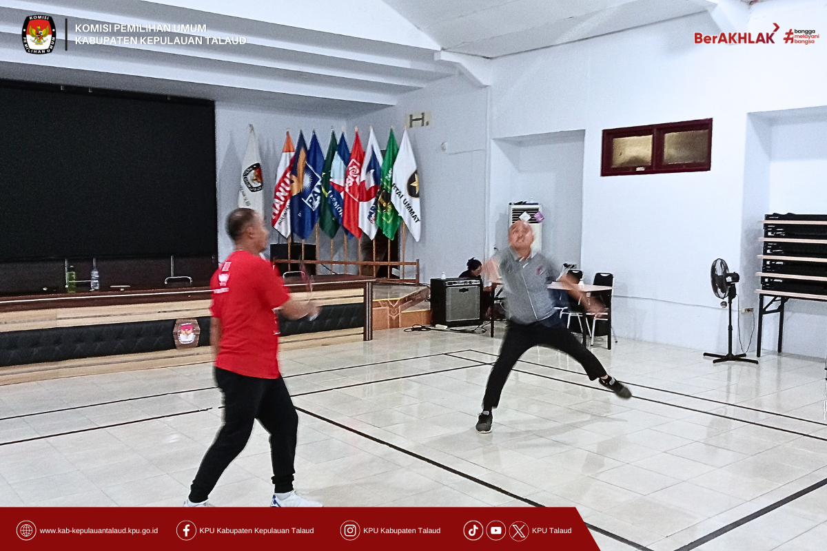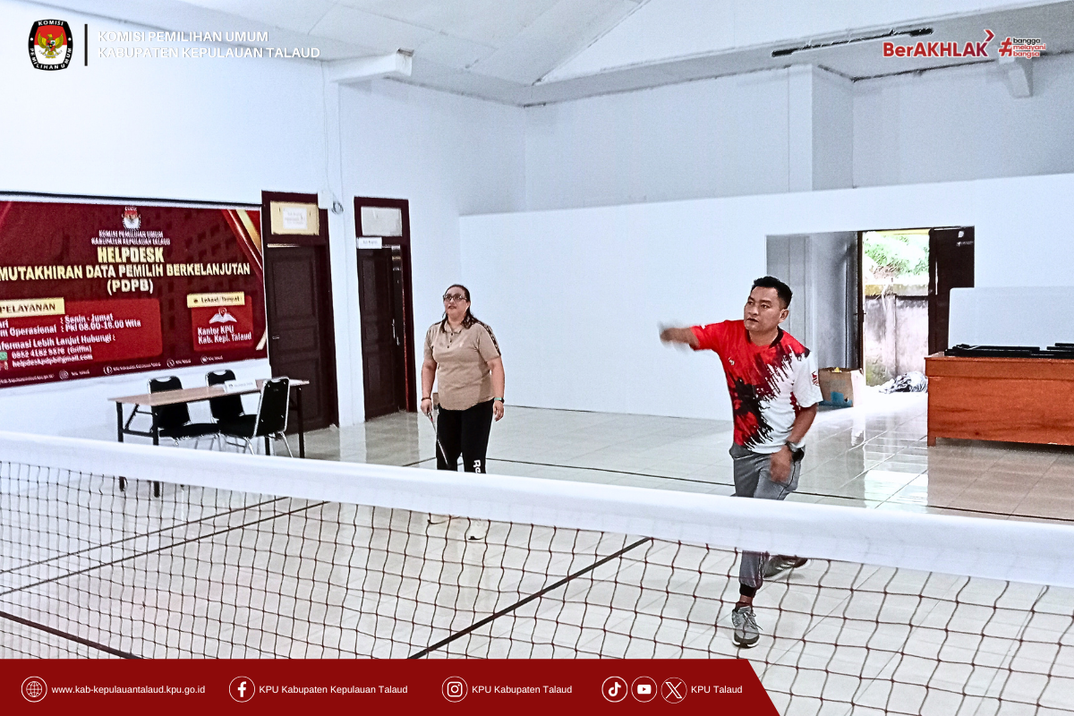 Ketua Divisi Sosdiklih Parmas SDM Hilda Jein Palandung dan Sekretaris KPU Talaud Jan Ch Kumaunang bersama jajaran Sekretariat melaksanakan olahraga pagi diantaranya Jalan Sehat dan Batminton