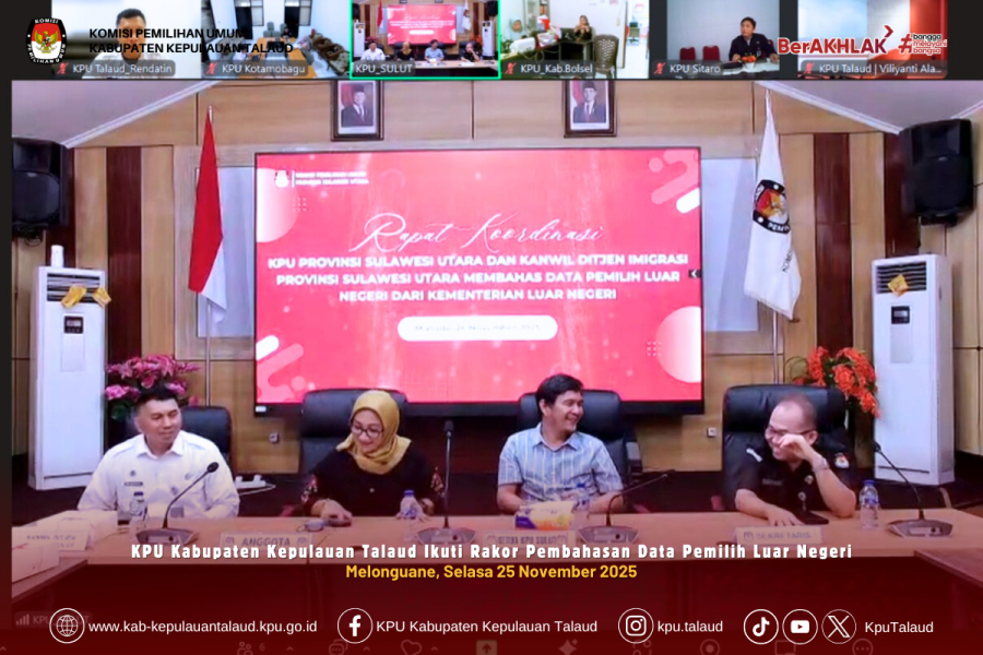 Melonguane, kab-kepulauantalaud.kpu.go.id — KPU Kabupaten Kepulauan Talaud turut berpartisipasi dalam Rapat Koordinasi bersama KPU Provinsi Sulawesi Utara dan Kantor Wilayah Ditjen Imigrasi Provinsi Sulut terkait pembahasan data pemilih luar negeri. Kegiatan ini berlangsung secara daring melalui platform Zoom pada Rabu, 26 November 2025, dengan fokus utama pada koordinasi lanjutan terhadap data pemilih yang berasal dari Kementerian Luar Negeri.Peserta rakor yang hadir adalah Ketua Divisi Perencanaan, Data dan Informasi, Kasubbag Perencanaan, Data dan Informasi serta Operator Sidalih KPU Kabupaten/Kota se-Sulawesi Utara.