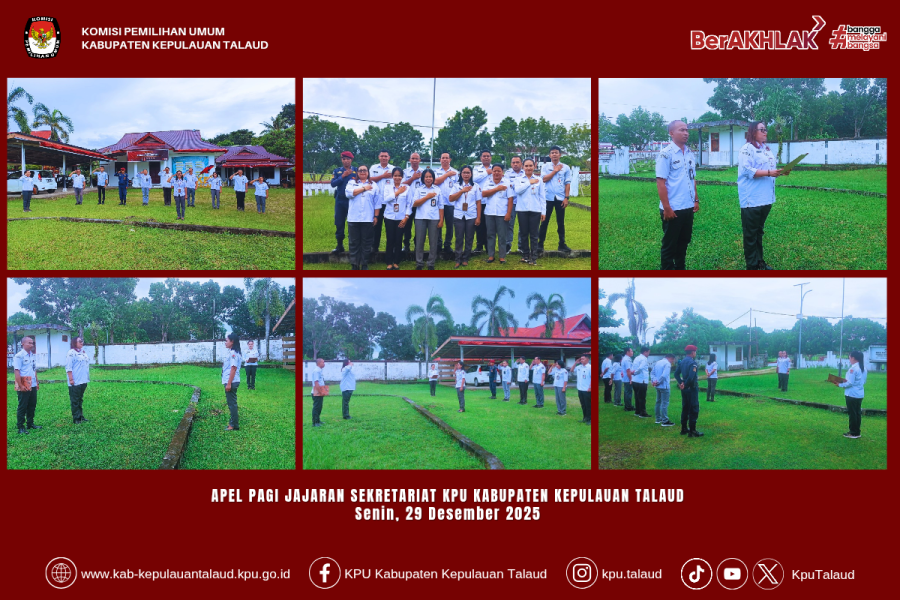 kab-kepulauantalaud.kpu.go.id – Komisi Pemilihan Umum (KPU) Kabupaten Kepulauan Talaud melaksanakan apel pagi pada Senin, 29 Desember 2025, bertempat di halaman Kantor KPU Kabupaten Kepulauan Talaud. Apel pagi ini merupakan kegiatan rutin yang dilaksanakan untuk meningkatkan kedisiplinan serta memperkuat koordinasi dan kebersamaan seluruh jajaran sekretariat.