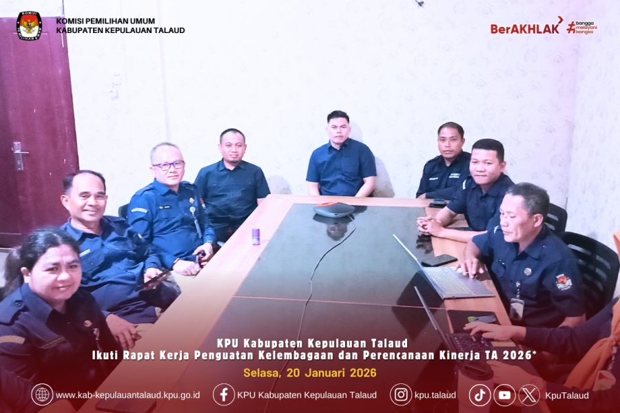 kab-kepulauantalaud.kpu.go.id – Komisi Pemilihan Umum Kabupaten Kepulauan Talaud mengikuti Rapat Kerja Penguatan Kelembagaan dan Perencanaan Kinerja Tahun Anggaran 2026 yang diselenggarakan oleh Komisi Pemilihan Umum Provinsi Sulawesi Utara bersama KPU Kabupaten/Kota se-Sulawesi Utara secara daring, Selasa (20/1/2026).
