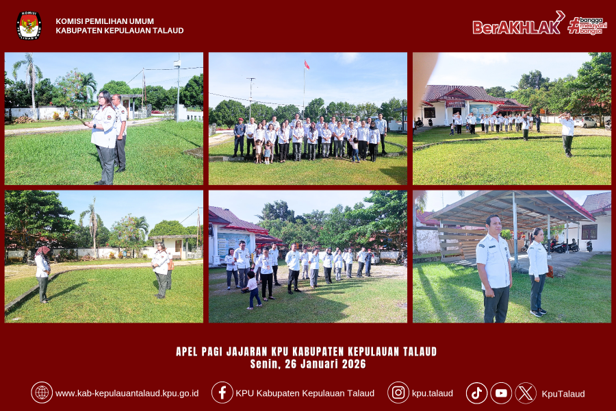 kab-kepulauantalaud.kpu.go.id– Jajaran Komisi Pemilihan Umum (KPU) Kabupaten Kepulauan Talaud melaksanakan apel pagi pada Senin, 26 Januari 2026, bertempat di halaman Kantor KPU Kabupaten Kepulauan Talaud.