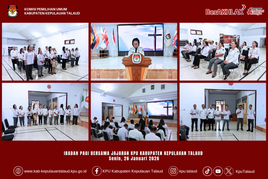 kab-kepulauantalaud.kpu.go.id– Jajaran Komisi Pemilihan Umum (KPU) Kabupaten Kepulauan Talaud melaksanakan kegiatan Ibadah Bersama Umat Kristen yang bertempat di Aula Kantor KPU Kabupaten Kepulauan Talaud, Senin (26/01/2026).