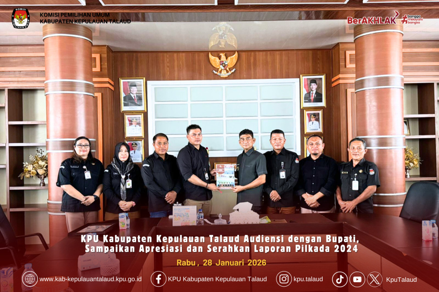 kab-kepulauantalaud.kpu.go.id – Komisi Pemilihan Umum (KPU) Kabupaten Kepulauan Talaud melaksanakan audiensi dengan Bupati Kepulauan Talaud, Welly Titah, pada Rabu, 28 Januari 2026, bertempat di Kantor Bupati Kepulauan Talaud. Audiensi ini dilaksanakan dalam rangka menyampaikan apresiasi atas dukungan dan kerja sama Pemerintah Daerah dalam menyukseskan Penyelenggaraan Pemilihan Kepala Daerah (Pilkada) Kabupaten Kepulauan Talaud Tahun 2024, sekaligus menyerahkan Buku Laporan Penyelenggaraan Pilkada dan Piagam Penghargaan kepada Bupati Kepulauan Talaud.