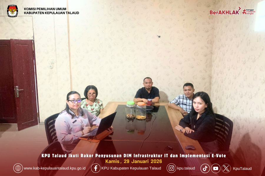 kab-kepulauantalaud.kpu.go.id – KPU Kabupaten Kepulauan Talaud turut ambil bagian dalam Rapat Koordinasi Penyusunan Daftar Inventarisasi Masalah (DIM) terkait infrastruktur teknologi informasi (IT) serta implementasi E-Vote yang diselenggarakan oleh KPU Provinsi Sulawesi Utara pada tanggal 29 Januari 2026.