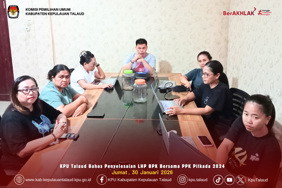 kab-kepulauantalaud.kpu.go.id – Komisi Pemilihan Umum (KPU) Kabupaten Kepulauan Talaud melaksanakan Rapat Koordinasi Penyelesaian Tindak Lanjut Hasil Pemeriksaan Badan Pemeriksa Keuangan (BPK) bersama Panitia Pemilihan Kecamatan (PPK) Pilkada Tahun 2024 pada Jumat, 30 Januari 2026.