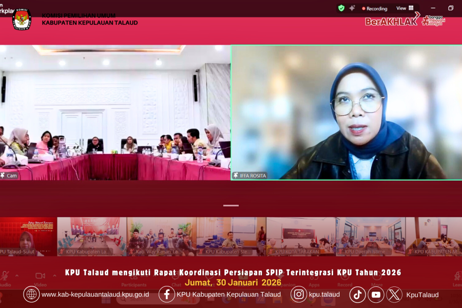 kab-kepulauantalaud.kpu.go.id- Komisi Pemilihan Umum (KPU) Kabupaten Kepulauan Talaud mengikuti Rapat Koordinasi Pelaporan Sistem Pengendalian Intern Pemerintah (SPIP) Rapat Koordinasi Pelaksanaan Penilaian Mandiri Maturitas SPIP Terintegrasi KPU Tahun 2026 yang diselenggarakan oleh Komisi Pemilihan Umum Republik Indonesia secara daring melalui zoom meetting bersama seluruh KPU Provinsi dan KPU Kabupaten/Kota, Jumat (30/1/2026).