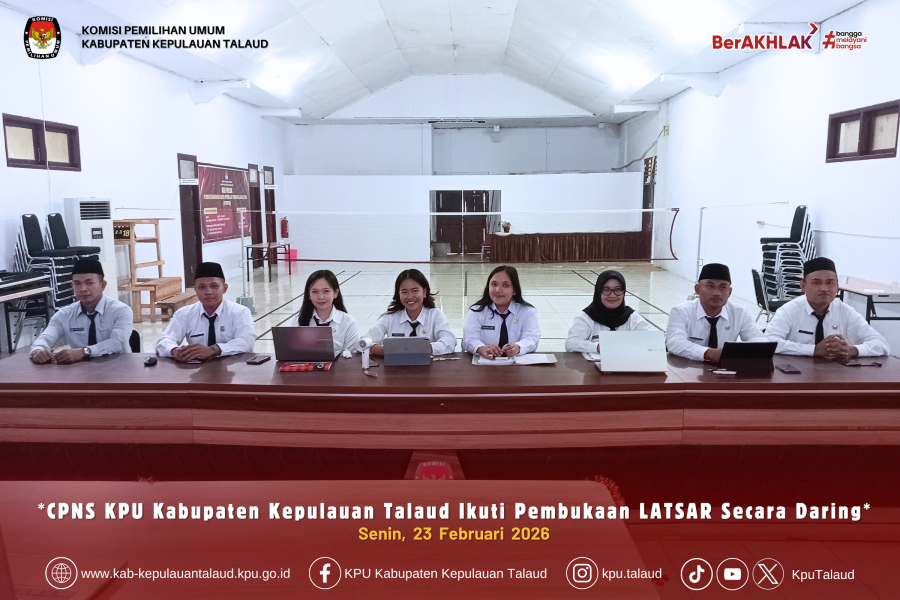 Talaud, 23 Februari 2026 — Calon Pegawai Negeri Sipil (CPNS) Komisi Pemilihan Umum Kabupaten Kepulauan Talaud mengikuti kegiatan pembukaan Pelatihan Dasar (LATSAR) CPNS yang dilaksanakan secara daring melalui Zoom, pada Senin (23/2/2026).