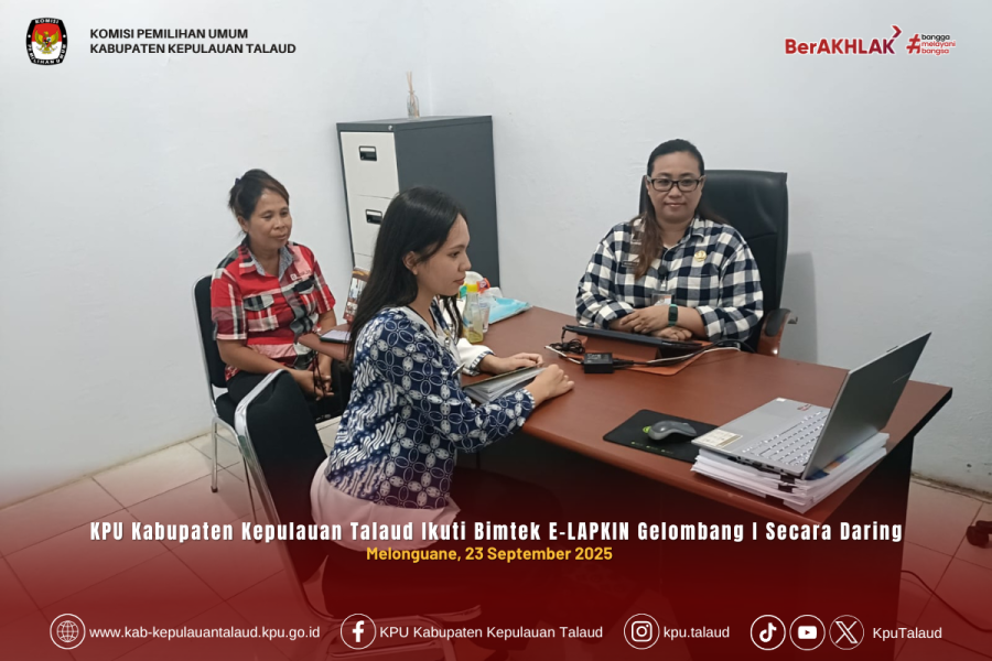 Melonguane, kab-kepulauantalaud.kpu.go.id – Komisi Pemilihan Umum (KPU) Kabupaten Kepulauan Talaud mengikuti kegiatan Bimbingan Teknis (Bimtek) E-LAPKIN Gelombang I yang diselenggarakan secara daring melalui aplikasi Zoom pada Selasa, 23 September 2025. Kegiatan ini diinisiasi oleh KPU Republik Indonesia dan diikuti oleh seluruh jajaran KPU provinsi maupun kabupaten/kota di seluruh Indonesia.