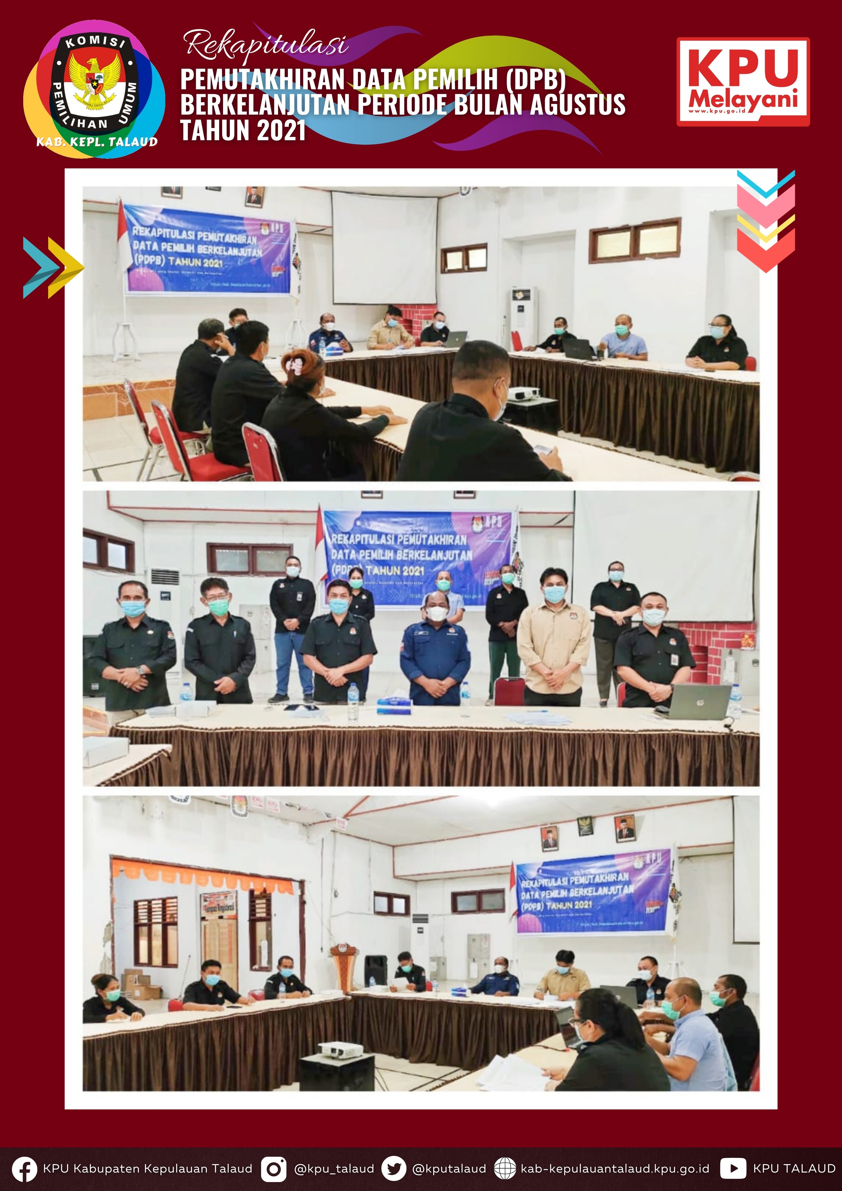 Melonguane, https://kab-kepulauantalaud.kpu.go.id - Rabu (01/09/2021), KPU Kabupaten Kepulauan Talaud kembali melakukan rekapitulasi pemutakhiran data pemilih berkelanjutan (PDPB) untuk periode bulan Agustus tahun 2021, sesuai dengan surat dinas KPU Nomor 366/PL.02-SD/01/KPU/IV/2021 tanggal 21 April 2021 perihal Pemutakhiran Data Pemilih Berkelanjutan Tahun 2021. Rapat yang dilaksanakan di Aula Kantor KPU Kabupaten Kepulauan Talaud dihadiri oleh Ketua dan Anggota KPU, Sekretaris KPU beserta Kasubbag.