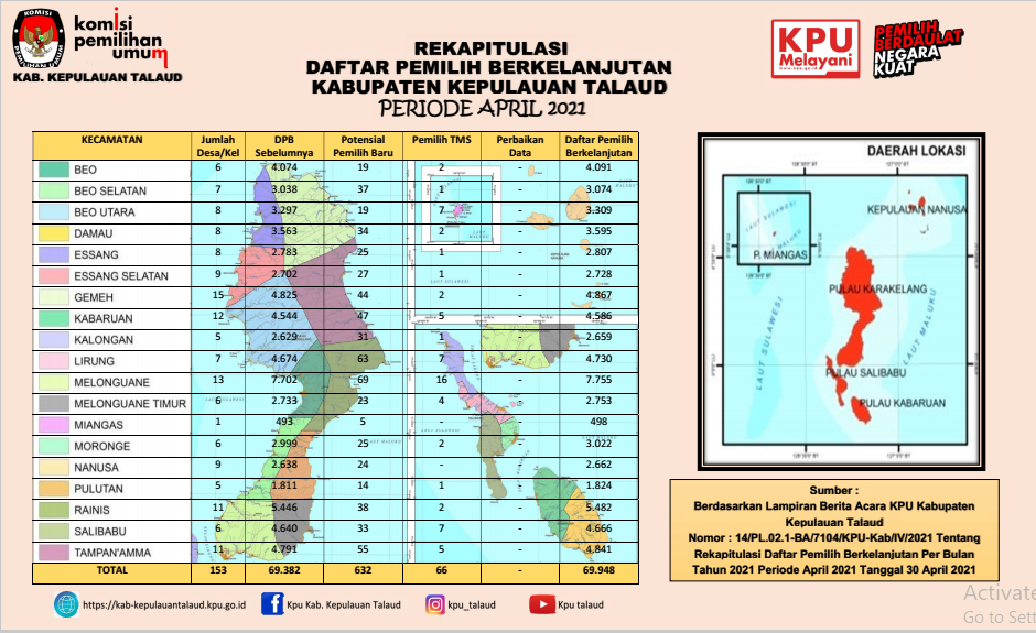 Dari hasil rekapitulasi PDPB bulan April 2021, jumlah pemilih di Kabupaten Kepulauan Talaud sebanyak 69.948 Pemilih terdiri dari laki-laki 35.507 pemilih, perempuan 34.441 pemilih. Untuk lebih lengkapnya bisa di akses melalui link download sebagai berikut : link download.