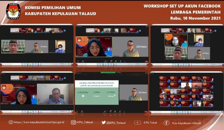 Melonguane, https://kab-kepulauantalaud.kpu.go.id - Dalam rangka meningkatkan kapasitas dan kapabilitas pengelolaan akun media sosial KPU serta koordinasi akun Fanpage Facebook KPU Provinsi dan KPU Kabupaten/Kota seluruh Indonesia, KPU Republik Indonesia menyelenggarakan Workshop Set Up Akun Facebook Lembaga Pemerintah, Rabu (10/11/2021), Admin/Operator akun media sosial KPU Kabupaten Kepulauan Talaud mengikuti workshop secara daring melalui aplikasi zoom meeting.