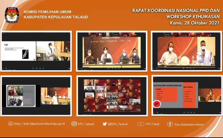 Melonguane, kab-kepulauantalaud.kpu.go.id - Dalam meningkatkan optimalisasi dan pengelolaan informasi publik serta peningkatan dan penguatan SDM kehumasan di lingkungan KPU, KPU Kabupaten Kepulauan Talaud mengikuti Rapat Koordinasi Nasional PPID dan Workshop Kehumasan yang diselenggarakan oleh KPU RI secara daring yang dilaksanakan selama tiga hari (27-29 Oktober 2021). Rapat dibuka oleh Plh. Ketua KPU RI I Dewa Kade Wiarsa Raka Sandi ini diikuti oleh seluruh Ketua dan Anggota Divisi Sosialisasi dan Pendidikan Pemilih, Sekretaris, Kepala Bagian, Kasubag serta Operator PPID, Website dan Media Sosial KPU Provinsi dan Kabupaten/Kota Se-Indonesia. Selanjutnya pemaparan materi dan diskusi panel oleh beberapa Narasumber, yaitu :