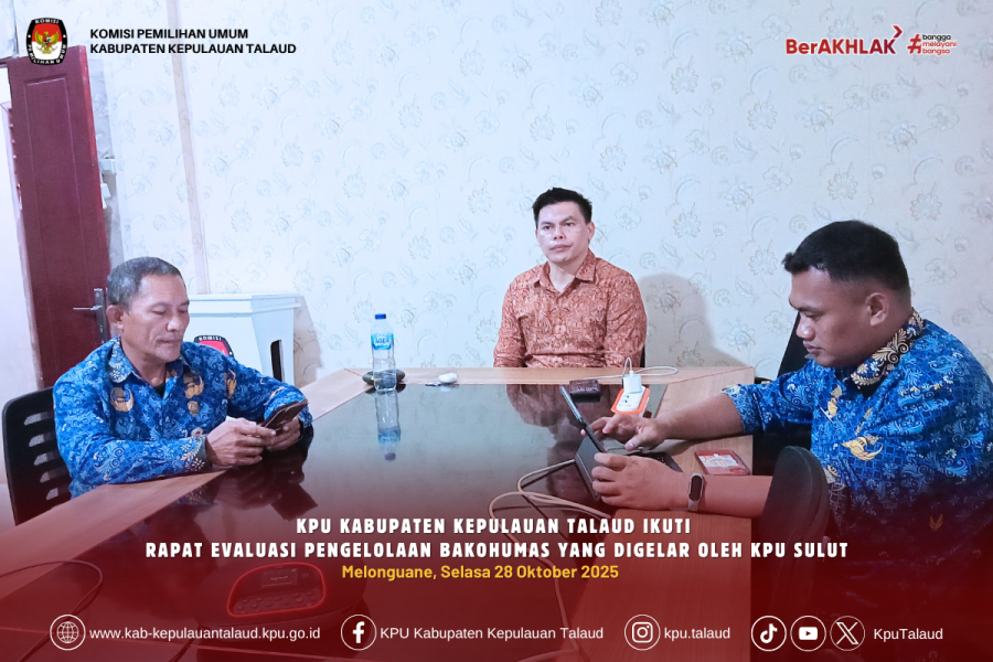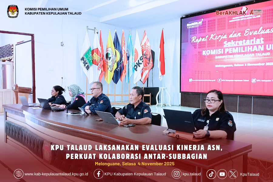 Melonguane, kab-kepulauantalaud.kpu.go.id — Sekretariat KPU Kabupaten Kepulauan Talaud melaksanakan kegiatan Rapat Kerja dan Evaluasi Kinerja ASN yang dihadiri secara lengkap oleh Sekretaris KPU Kabupaten Kepulauan Talaud, Jan Ch. Kumaunang, bersama seluruh Kepala Subbagian, staf ASN dan PPNPN Sekretariat KPU Kabupaten Kepulauan Talaud. Kegiatan ini diselenggarakan sebagai bagian dari upaya memperkuat disiplin, sinergi, dan peningkatan kualitas kinerja aparatur sekretariat dalam mendukung pelaksanaan tugas kelembagaan penyelenggara pemilu dan pemilihan di wilayah perbatasan utara Negara Kesatuan Republik Indonesia.