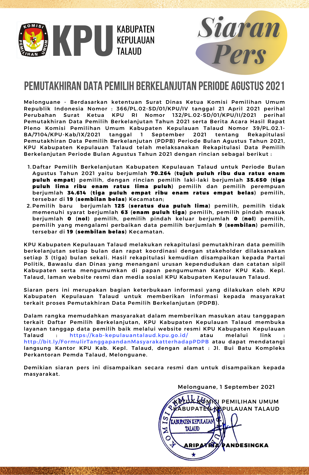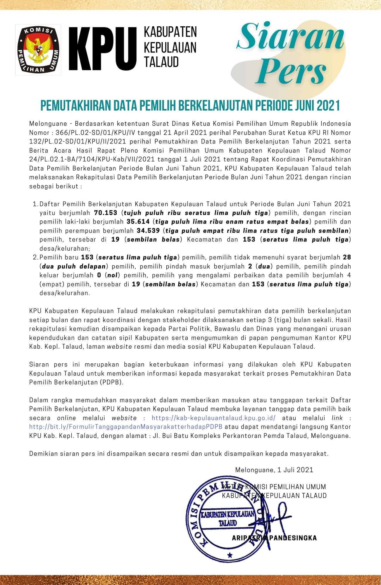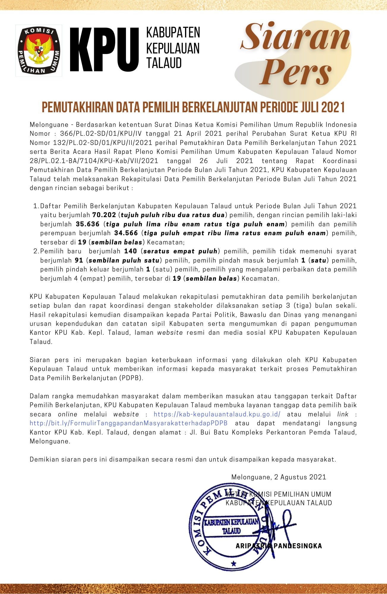 Melonguane, https://kab-kepulauantalaud.kpu.go.id - Dilansir dari laman website resmi KPU Republik Indonesia, Selasa (17/08/2021), Komisi Pemilihan Umum (KPU) merespon disinformasi yang berkembang di media sosial terkait kabar pemunduran jadwal pelaksanaan Pemilu dan Pemilihan Tahun 2024 menjadi tahun 2027. Rilis resmi yang disampaikan kepada khalayak, pada poin pertama menyebut bahwa isi dari pemberitaan cnnindonesia.com yang memuat wacana pemunduran pelaksanaan Pemilu dan Pemilihan di tahun 2027 adalah respon kondisi saat itu (Juni 2020) dimana tengah muncul usulan revisi UU Nomor 7 Tahun 2017 tentang Pemilu dan UU Nomor 10 Tahun 2016 tentang Pemilihan. Pada poin selanjutnya, juga disampaikan bahwa KPU RI melalui Ilham Saputra yang pada saat itu menjabat sebagai anggota KPU RI juga telah menyampaikan klarifikasi kepada media massa bahwa sesuai UU Pemilu dan Pemilihan dilaksanakan di tahun 2024. Hal ini sebagaimana penjelasan Pasal 167 ayat (1) UU Nomor 7 Tahun 2017 dan Pasal 201 ayat (8) UU Nomor 10 Tahun 2016. Sikap ini semakin dipertegas melalui pernyataan di poin enam yang mengatakan hasil koordinasi dalam bentuk Tim Kerja Bersama yang terdiri dari DPR, Kemendagri, KPU, Bawaslu dan DKPP menyepakati Pemilu dan Pemilihan tetap diselenggarakan pada tahun 2024 sebagaimana UU Nomor 7 Tahun 2017 dan UU Nomor 10 Tahun 2016. Yakni Pemilu direncanakan digelar pada 21 Februari 2024 dan Pemilihan Kepala Daerah digelar pada 27 November 2024. (humas kpu ri) Berikut rilis resmi KPU RI : Rilis Pemilu dan Pemilihan di 2024.