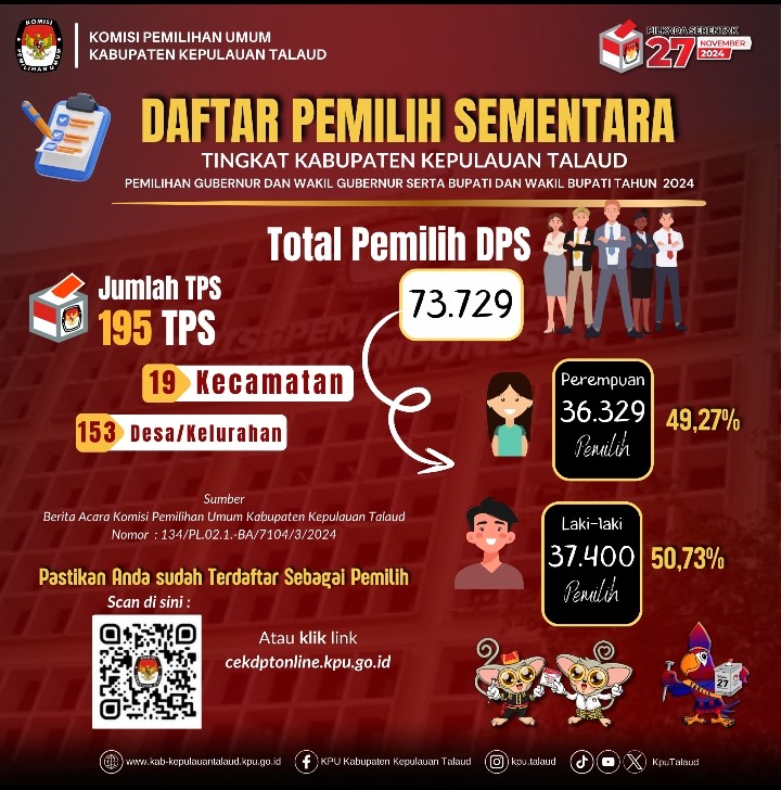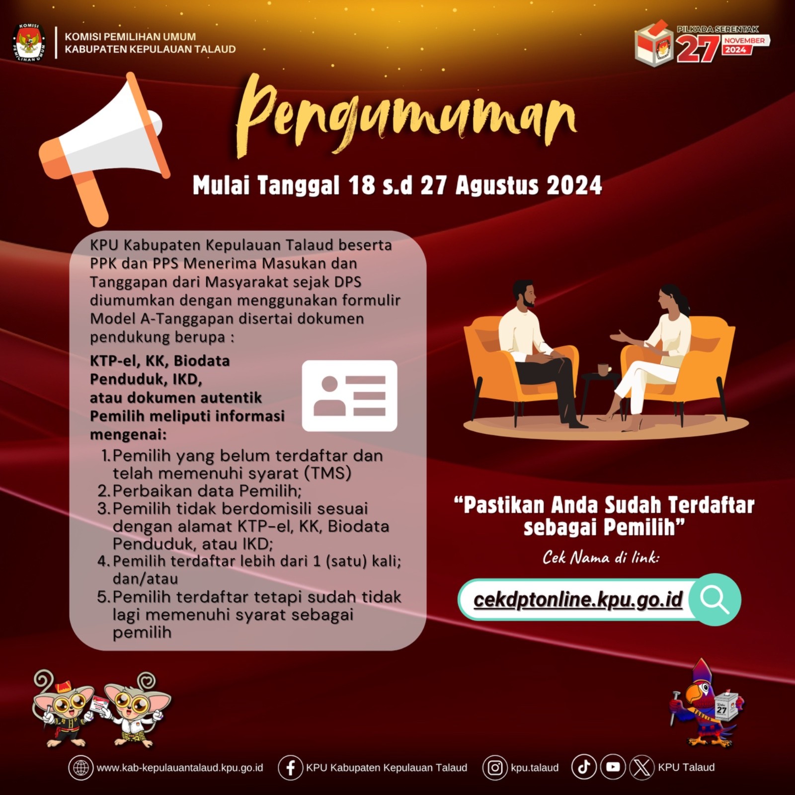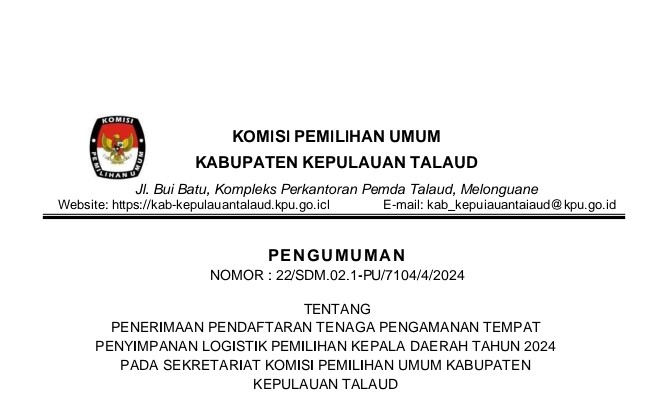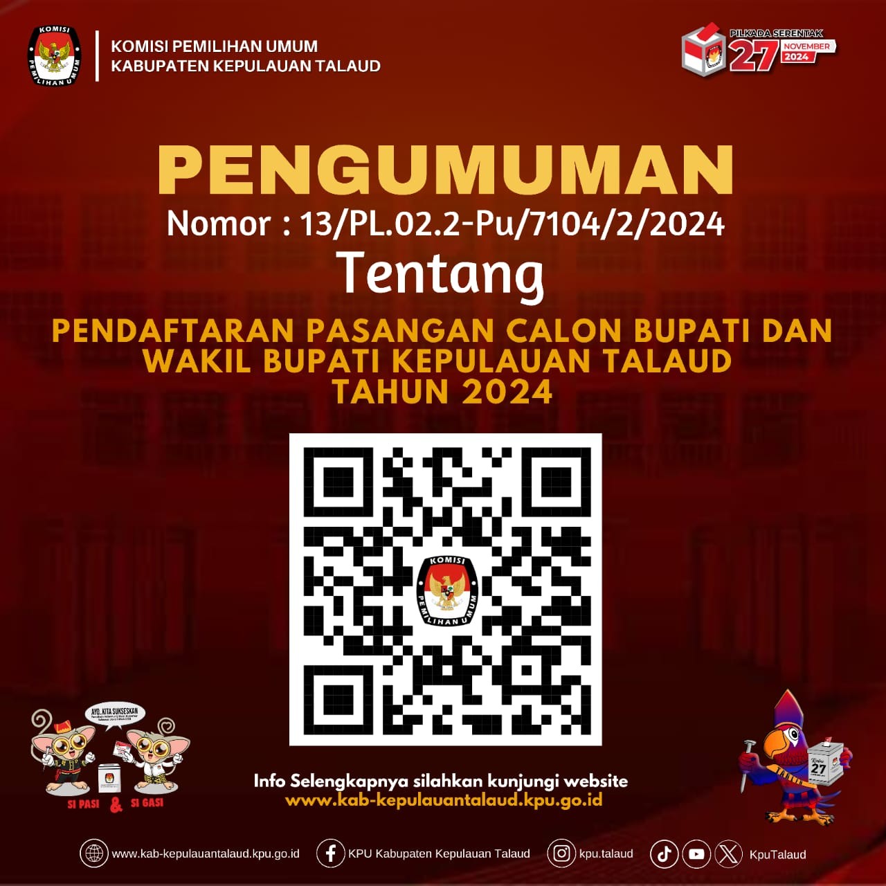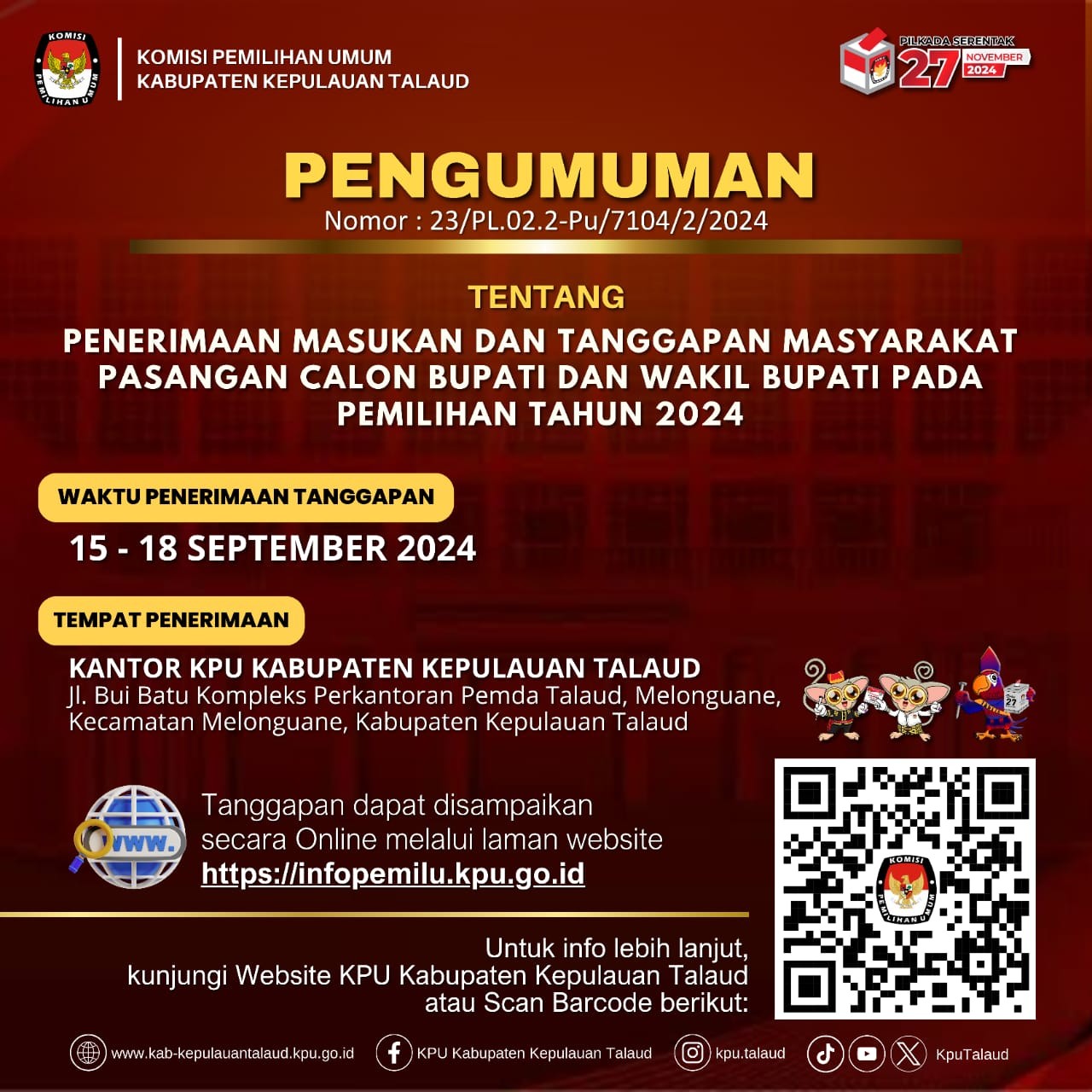Melonguane, kab-kepulauatalaud.kpu.go.id- Bahwa Untuk Melaksanakan Ketentuan Pasal 137 Peraturan KPU Nomor 8 Tahun 2024 Tentang Pencalonan Gubernur dan Wakil Gubernur, Bupati dan Wakil Bupati Serta Walikota dan Wakil Walikota Yang Telah di Ubah Dengan Peraturan KPU Nomor 10 Tahun 2024 Tentang Perubahan Atas Peraturan KPU Nomor 8 Tahun 2024 Tentang Pencalonan Gubernur dan Wakil Gubernur, Bupati dan Wakil Bupati Serta Walikota dan Wakil Walikota, Komisi Pemilihan Umum Kabupaten Kepulauan Talaud Mengumumkan Penerimaan Masukan dan Tanggapan Masyarakat Terhadap Pasangan Calon Bupati dan Wakil Bupati Kepulauan Talaud