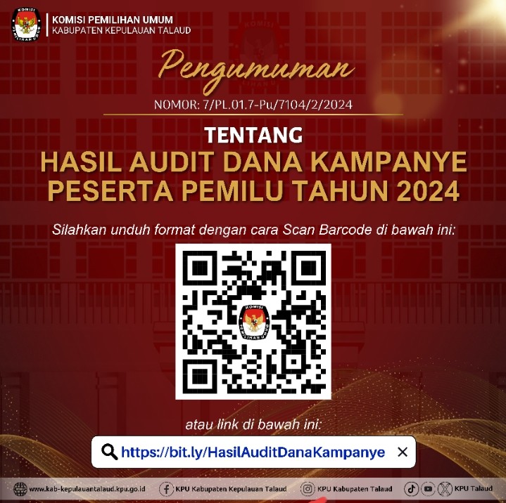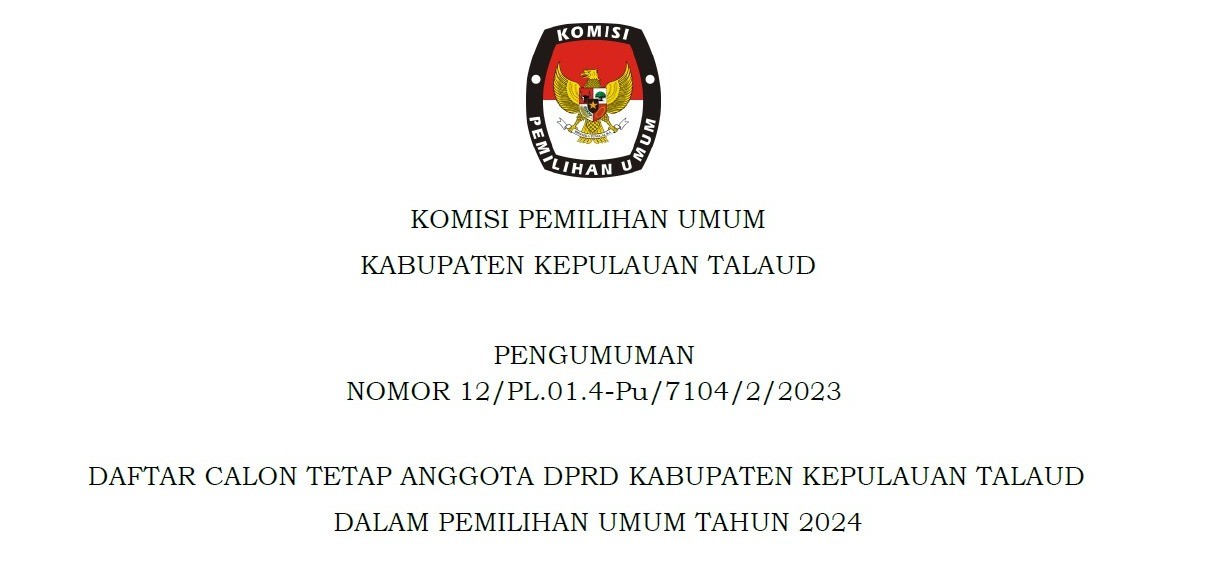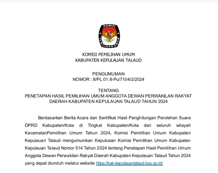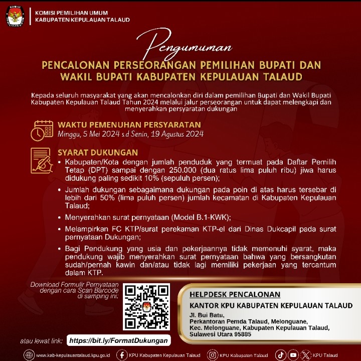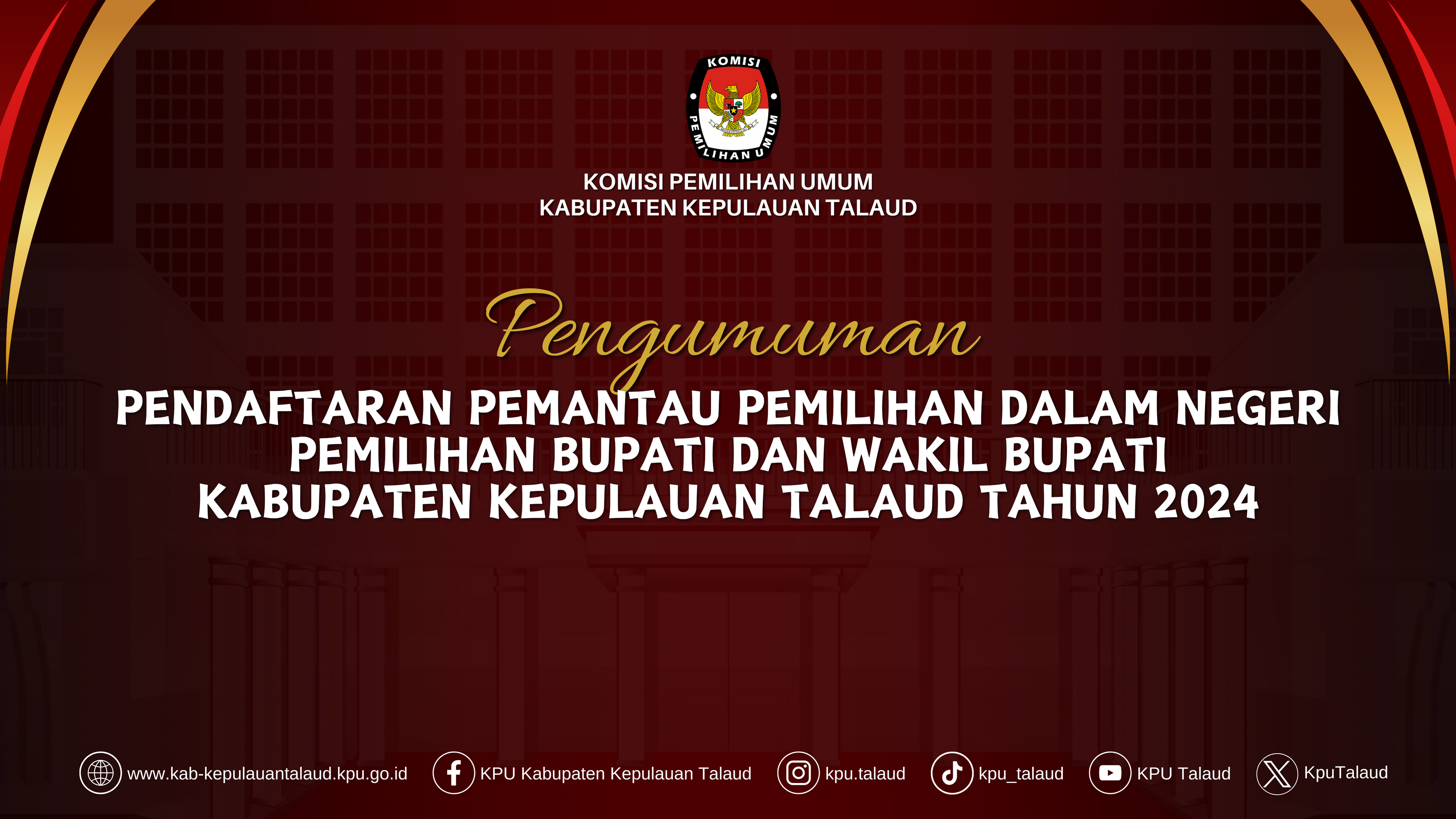 Dalam rangka melaksanakan Peraturan Komisi Pemilihan Umum No 2 Tahun 2024 tentang tahapan dan Jadwal Pemilihan Gubernur dan Wakil Gubernur, Bupati dan Wakil Bupati, serta Walikota dan Wakil Walikota tahun 2024, Peraturan Komisi Pemilihan Umum no 9 tahun 2022 tentang Tentang Partisipasi Masyarakat dalam Pemilihan Umum, Pemilihan Gubernur dan Wakil gubernur, Bupati dan Wakil Bupati dan/atau Walikota dan Wakil Walikota, Keputusan Komisi Pemilihan Umum Kabupaten Kepulauan Talaud nomor: 509 tahun 2024 tentang pedoman teknis pelaksanaan tahapan progran dan penyelenggaraan pemilihan Bupati dan Wakil Bupati Kabupaten Kepulauan Talaud tahun 2024 serta Keputusan Komisi Pemilihan Umum Kabupqten Kepulauan Talaud nomor 511 tahun 2024 tentang pedoman teknis pendaftaran Pemantau dan Pemantauan Pemilihan Bupati dan Wakil Bupati Kepulauan Talaud tahun 2024, maka Komisi Pemilihan Umum Kabupaten Kepulauan Talaud mengumumkan pendaftaran Pemantau Pemilihan Dalam Negeri Pemilihan Bupati dan Wakil Bupati Kabupaten Kepulauan Talaud tahun 2024 harus memenuhi ketentuan sebagai berikut: