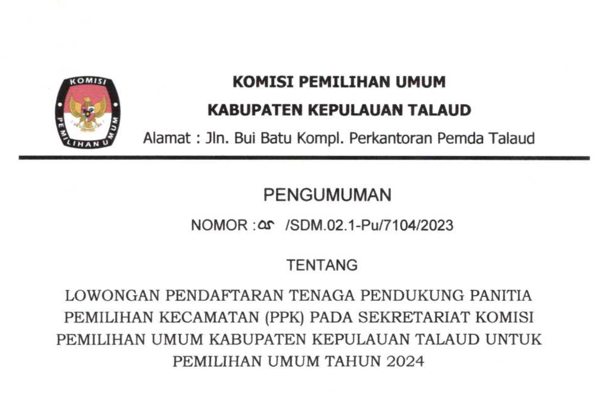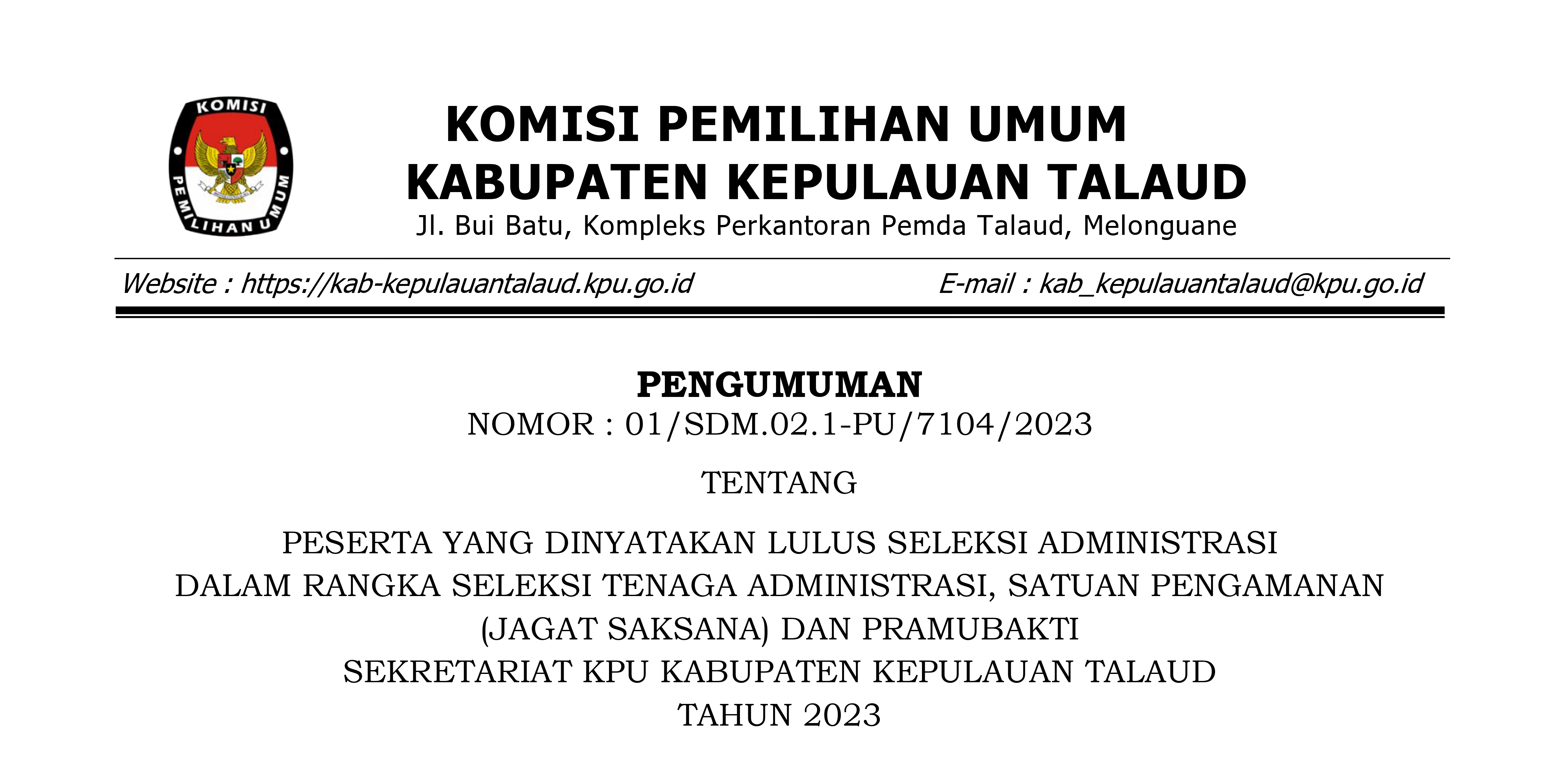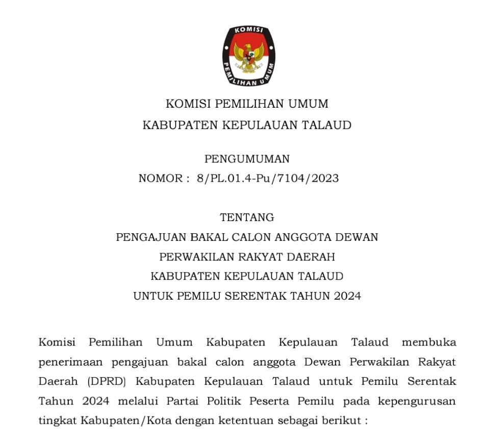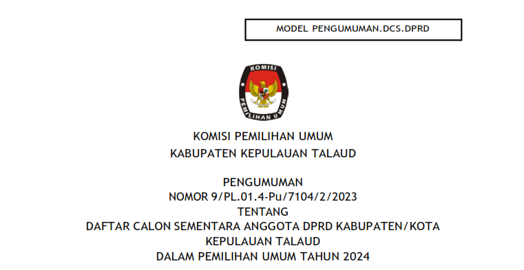 Bahwa untuk melaksanakan ketentuan Pasal 70 Peraturan KPU Nomor 10 Tahun 2023 tentang Pencalonan Anggota Dewan Perwakilan Rakyat, Dewan Perwakilan Rakyat Daerah Provinsi, dan Dewan Perwakilan Rakyat Daerah Kabupaten/Kota, KPU Kabupaten Kepulauan Talaud mengumumkan Daftar Calon Sementara (DCS) Anggota DPRD Kabupaten Kepulauan Talaud dan persentase keterwakilan perempuan dalam Daftar Calon Sementara (DCS) sebagaimana terlampir.